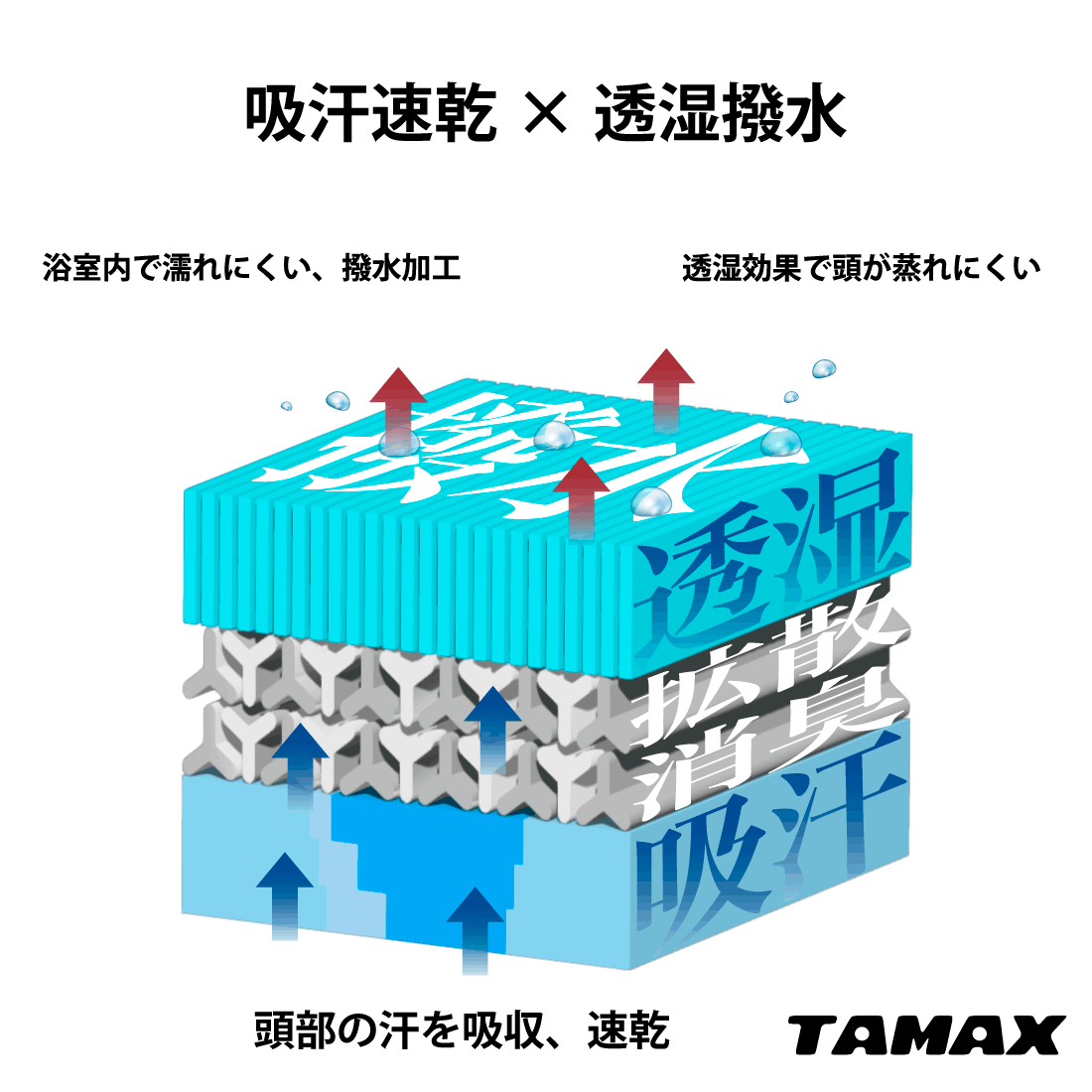 表は撥水性と透湿性を兼ね備える機能素材を使用。万が一浴室に落としてしまってもサウナハット濡れにくく、快適に過ごせます。